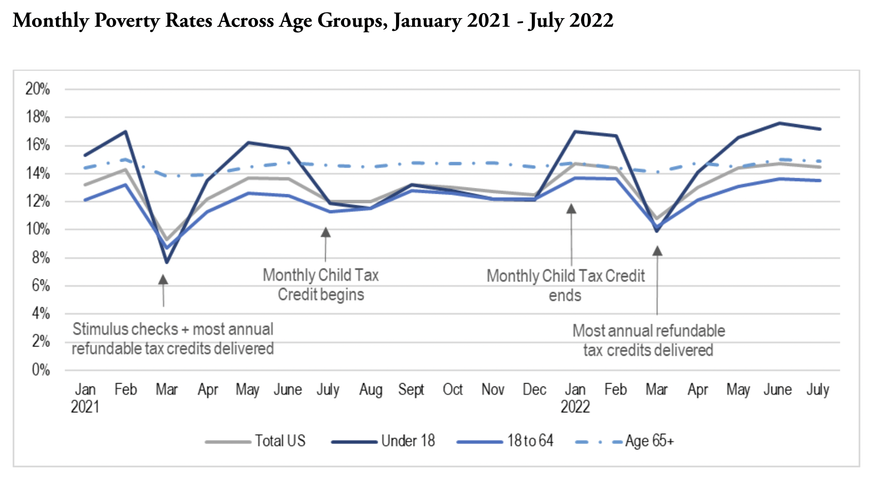 The July 2022 child poverty rate was 17.2%, 5.3 percentage points higher than the rate of 11.9% in July 2021. One significant source of supplementary income was available to low-income families in July of last year that is absent this year: the advance expanded CTC. The child poverty rate also jumped from 12.1% in December 2021 to 17% in January 2022, which coincided with the end of the advance CTC payments. The relationship is clear: the expanded CTC lifted millions of children out of poverty and sent many back under the threshold absent the monthly payments.